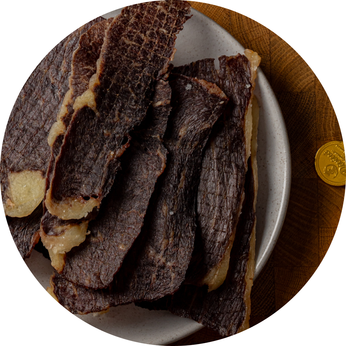 Crafted from a select part of the Wagyu Silverside, a cut located on the hindquarter of the cow. This hardworking muscle develops dense marbling while remaining leaner than prime steak cuts, offering a perfect balance of richness and intensity. Through our meticulous dehydration process, this exceptional beef develops a dark, rich colour, a reflection of its bold, concentrated flavour.